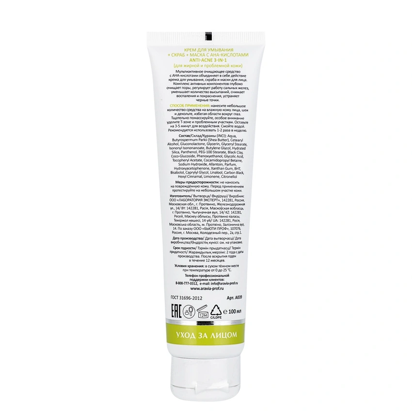 ARAVIA Laboratories, Крем для умывания+скраб+маска с АНА-кислотами Anti-Akne 3в1, 100 мл
